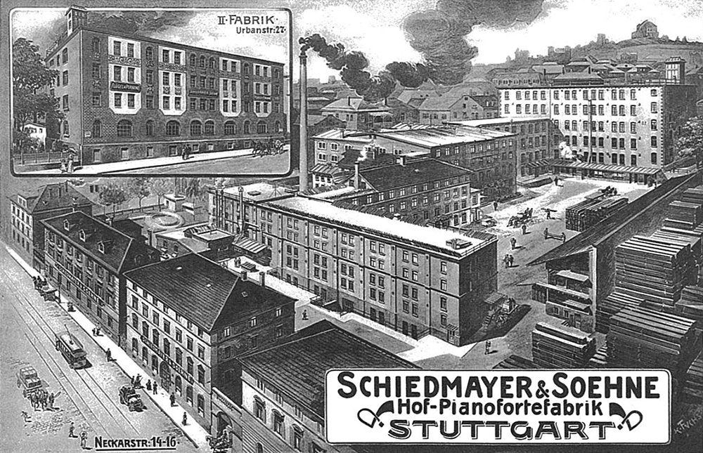 Balthazar Schiedmayer started out in 1735 in Erlangen near Stuttgart, Germany, where he made his first pianos. In 1809, he moved his business to Schillerplatz, Stuttgart,and named it Schiedmayer & Soehne. The business produced quality pianos until the 1940s, with production at 11,000 in 1880 and 127,000 in 1984. In 1853, the brothers (cousins?) moved to Stuttgart’s Neckerstrasse and made pianos under the name J&P Schiedmayer until the 1970s. Their pianos were well made, with a stunning build quality and especially an impressive musicality for a small brand. J&P Schiedmayer production figures: 14,300 in 1880 – 70,000 in 1970. Schiedmayer pianos from all eras are today prized by connoisseurs for their musical quality, with a sonority that resembles a Bechstein in its depth. Scheidmayer pianos have modern actions, either Berling or Schwander.