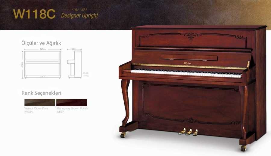 Tarihçesi: 1852 yılında Albert Weber tarafından New York’ta kuruldu. Şirket 1986 yılında Young Chang’ın bir parçası oldu ve 2006 yılında Hyundai Development Company tarafından satın alındı. Amerikalı tasarımcı Del Fandrich, hem Young Chang hem de Weber serilerini yeniden tasarladı. Şu anda Young Chang piyano serisini üç bölüme ayırdı: Young Chang, Weber ve Albert Weber koleksiyonları. W118, üretilen Weber serisinin bir parçasıdır.